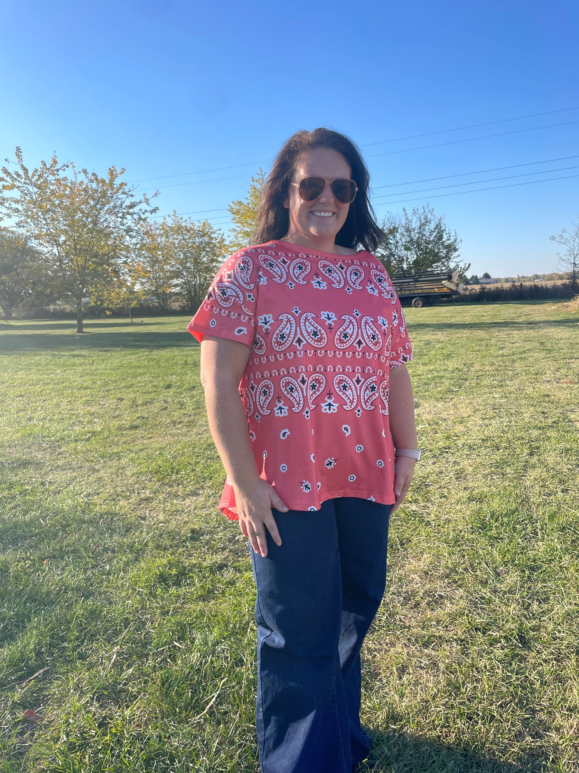 This blouse is a great pick for hot days or to layer under jackets. The paisley design adds color and boho charm, while side cuts give a modern twist and flattering movement.